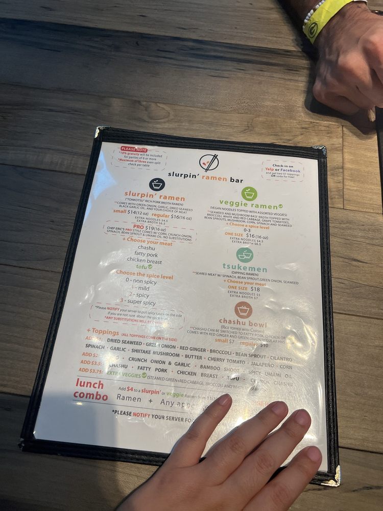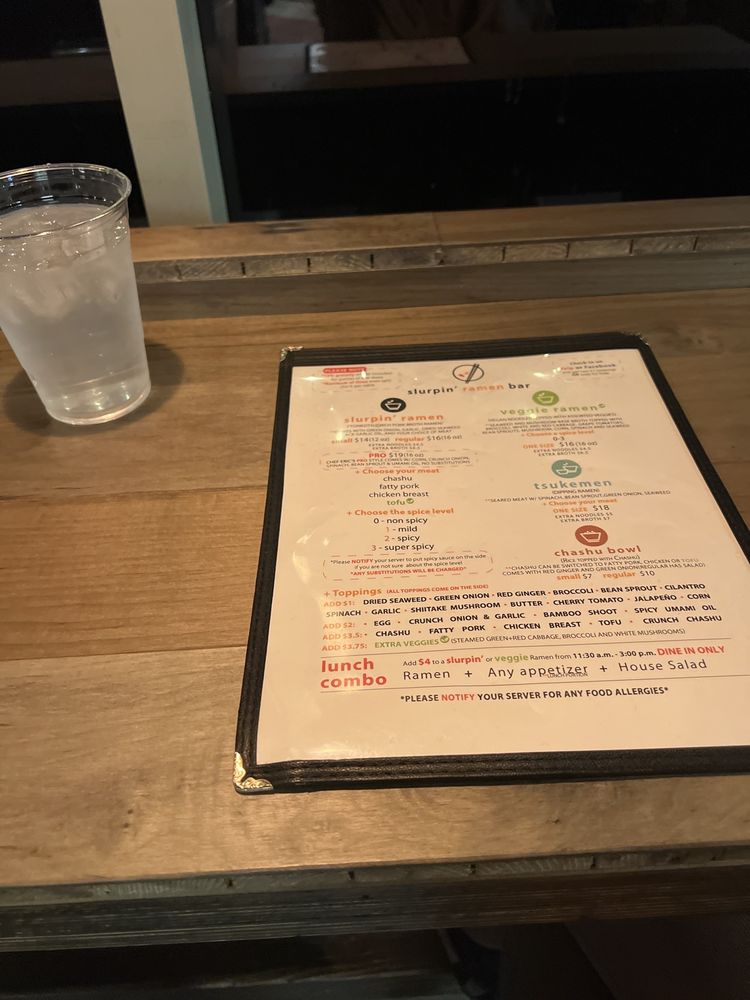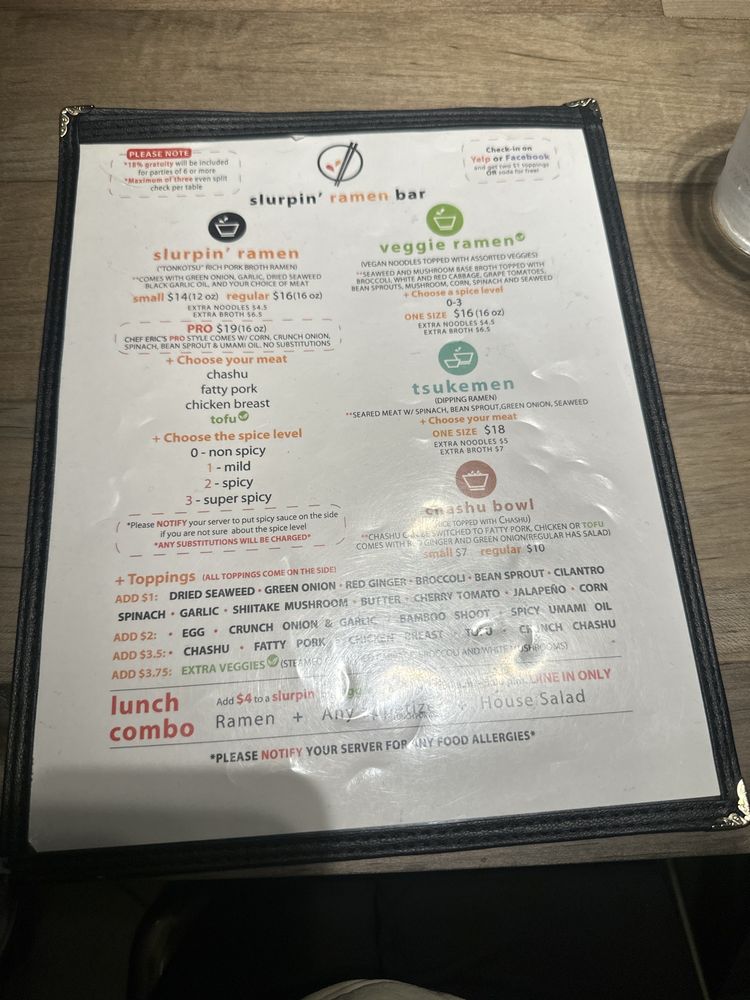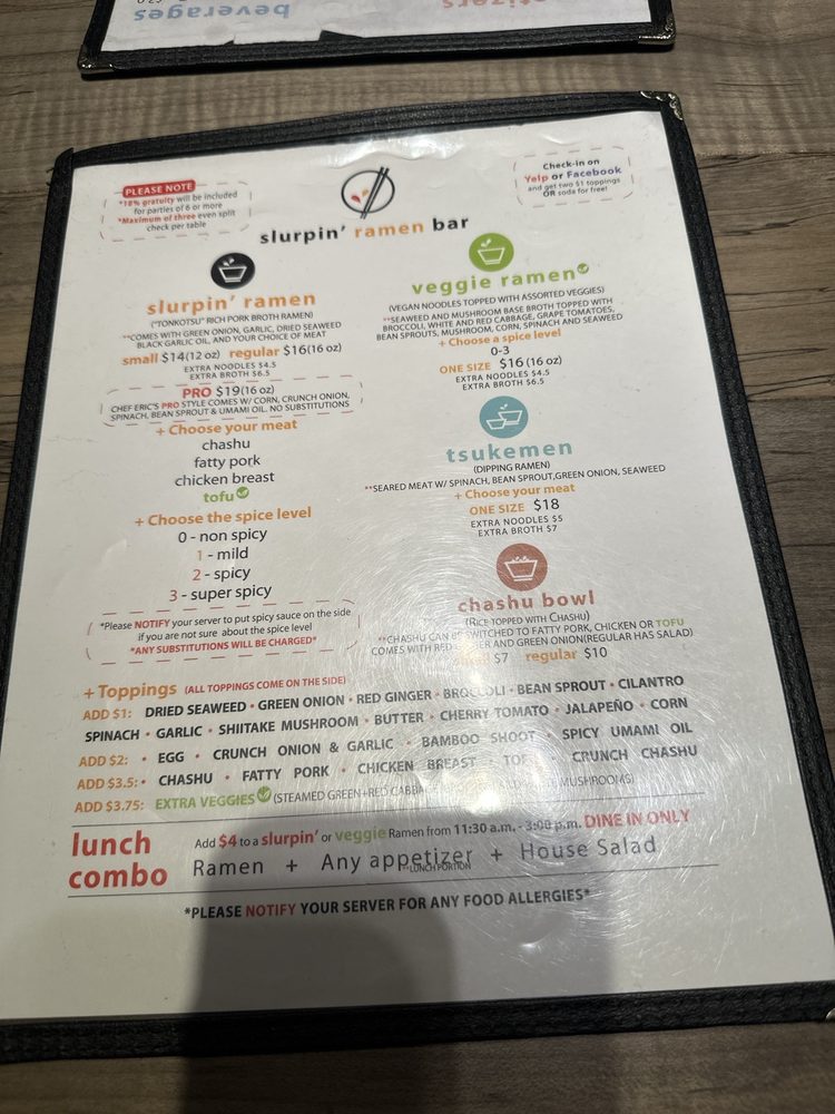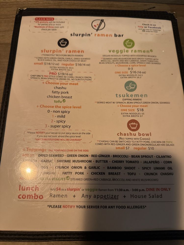 Slurpin Ramen Regular Size(16oz)Tonkotsu Broth + Choice of Meat + NoodlesGreen Onion, Seaweed, Garlic, Black Garlic and BaseSpice Level #0-3(0= No Spice, 3= Super Spicy)Please do not "note" additional toppings on here or your order will be cancelled. Toppings are all under ".topping"