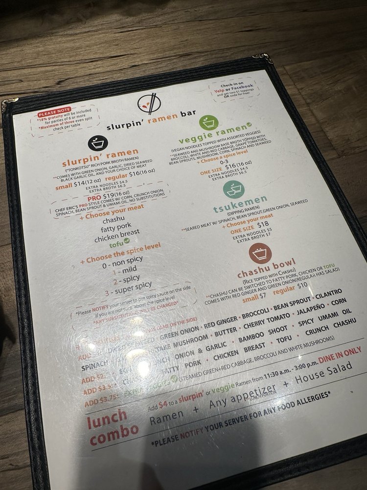Slurpin Ramen PRO - 16ozChef Eric's Style - 16oz SizeTonkotsu Broth + Choice of Meat + NoodlesGreen Onion, Seaweed, Garlic, Black Garlic and BaseSpice Level #0-3(0= No Spice, 3= Super Spicy)Comes w/ Umami Oil, Corn, Bean Sprout, Spinach and Crunch Onion**NO SUBSTITUTIONS**
