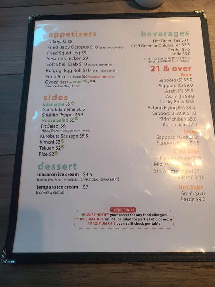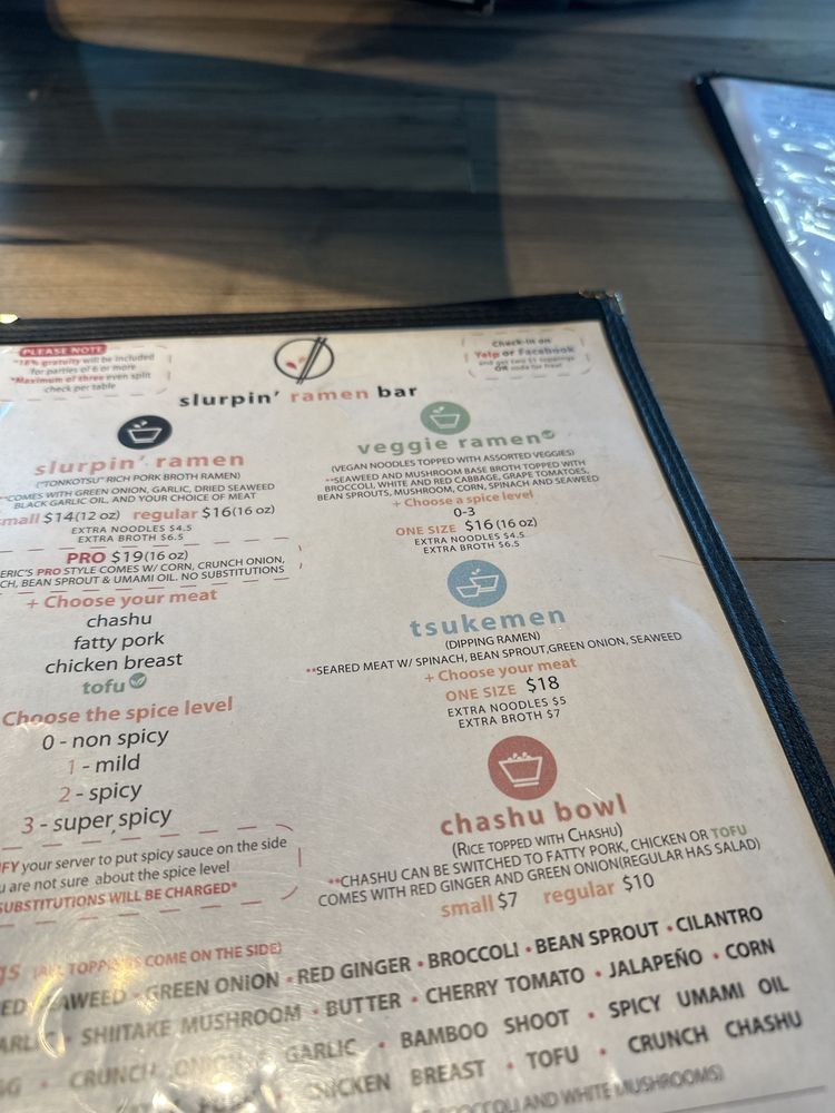 Introducing the menu at Slurpin’ Ramen Bar - City of Industry, a trendy and hipster spot offering flavorful ramen bowls with customizable options. The menu includes small and regular-sized ramen bowls with tonkotsu broth and a choice of meat, topped with green onion, seaweed, and garlic. Appetizers like takoyaki, fried squid legs, and sesame chicken provide a tasty start to your meal. Side options like edamame and shishito peppers offer additional flavors. Customers rave about the delicious ramen, with some recommending the super spicy option for a medium kick. The attentive service and authentic Japanese decor add to the overall dining experience. Don't miss out on the free toppings or soda with a Yelp check-in. Visit Slurpin’ Ramen Bar for a satisfying and customizable ramen experience.